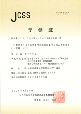 分析計測事業部 大阪計測グループは、2003年12月10日付けでJCSSにおける電気等の認定事業者(認定番号0141)として、独立行政法人 製品評価技術基盤機構(NITE)より認定されました。その後、計量法改正に伴いJCSS制度が変更され、大阪計測グループは2009年3月31日に、伊丹計測グループは2010年2月25日に、横浜計測グループは2025年9月10日にJCSS校正事業者として登録されました。
